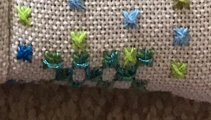 I worked a tiny sample in a corner of the fabric. I was pleased to go against the Blue and green should never be seen without a colour in between mantra of my childhood!
