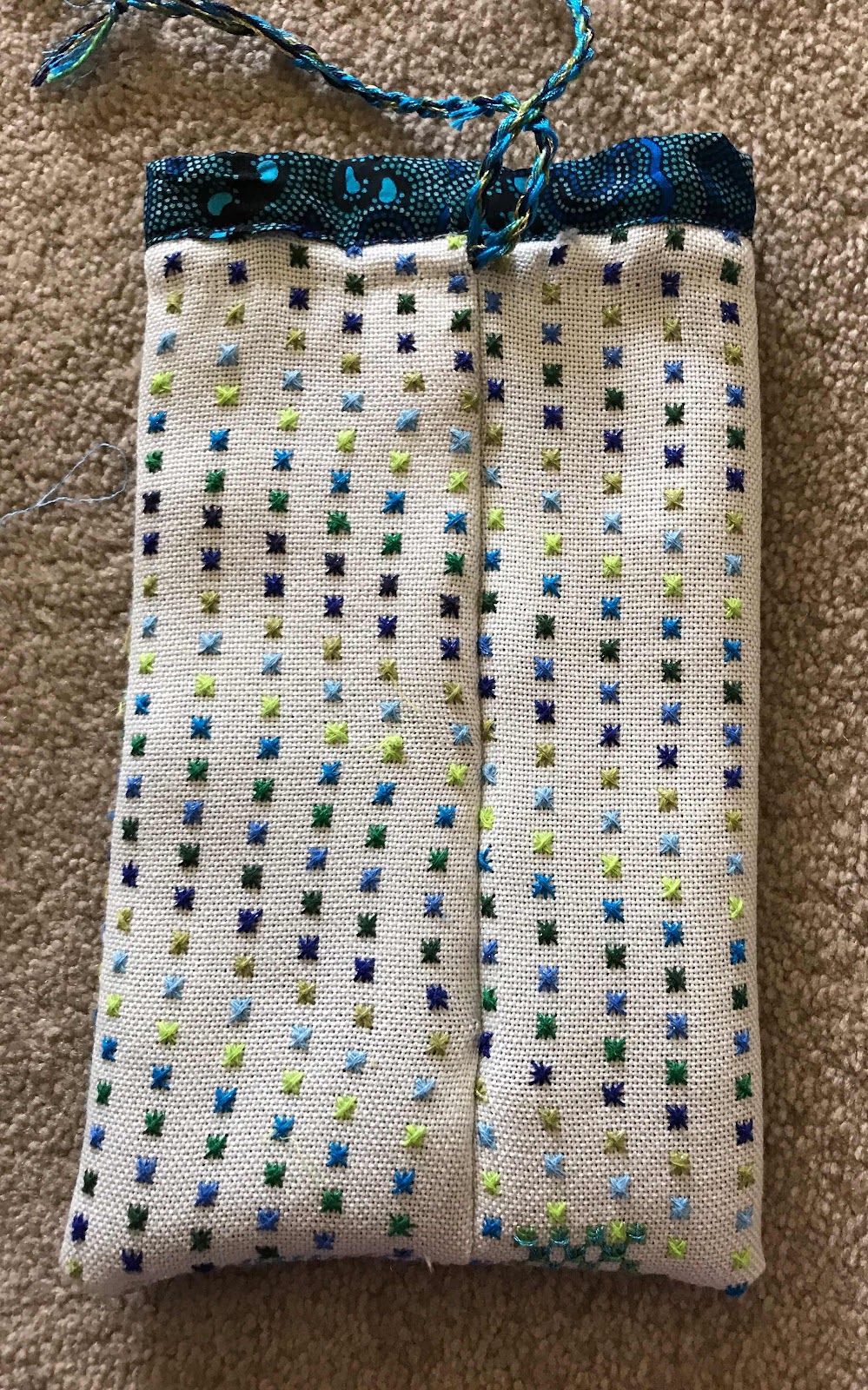 It's a very interestng piece combining pulled work and surface work. I like the blue and green that you chose and think they go well together. Well done!